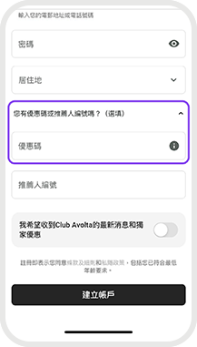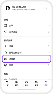 於「帪戶」內的「優惠碼」一欄輸入專屬優惠碼